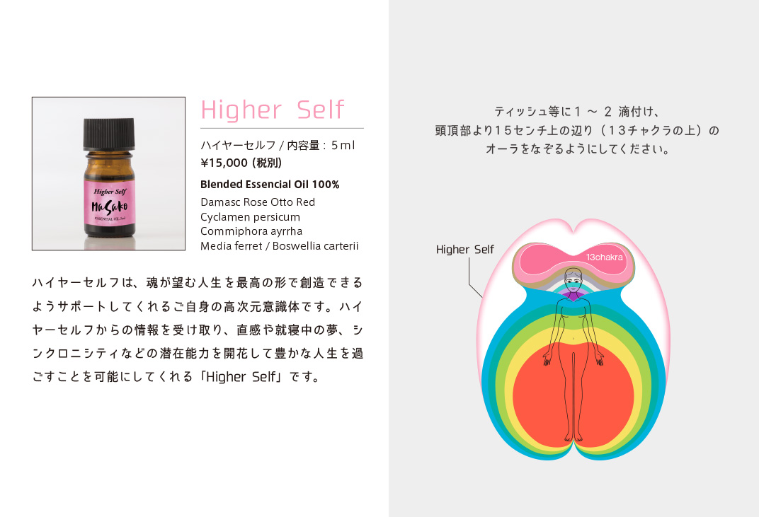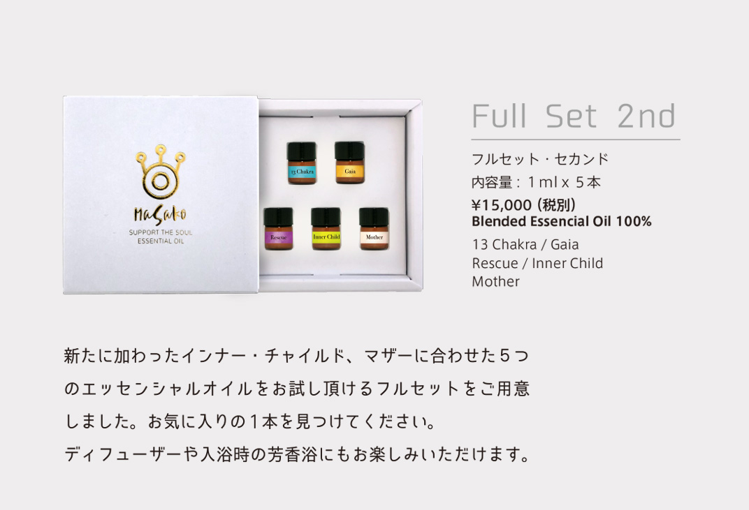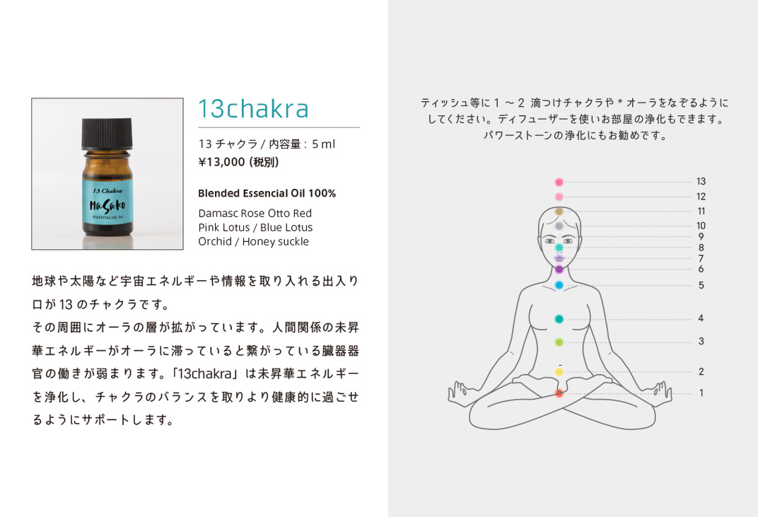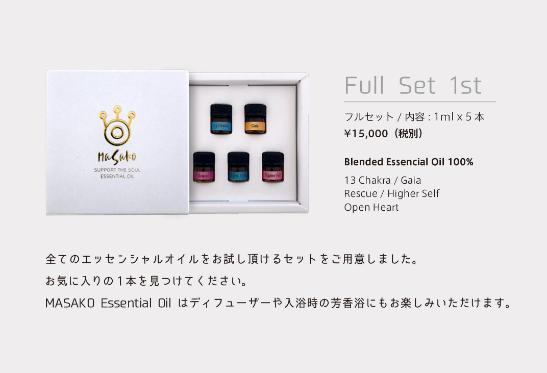 植物から抽出された100%エッセンシャルオイルはさまざまな分野で活用されています。香りごとに独自のエネルギーを持っていて私たちの身体を癒します。身体には13カ所のエネルギーの渦があり、それをチャクラと呼んでいます。精油とそれぞれのチャクラにあった周波数を照らし合わせ、独自の発想を用いMASAKO Essential Oilを開発しました。世界中から集めた100種類以上の最高級精油からセレクト、土地と環境、天候や気温、熟成度による精油の違いに配慮しながら注意深くブレンドした逸品です。日常生活におけるストレスの緩和や心身バランスを整えるため、より豊かに生活を楽しむためご愛用ください。