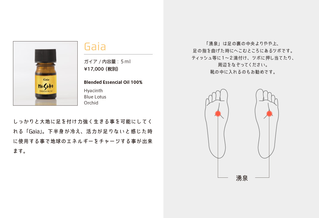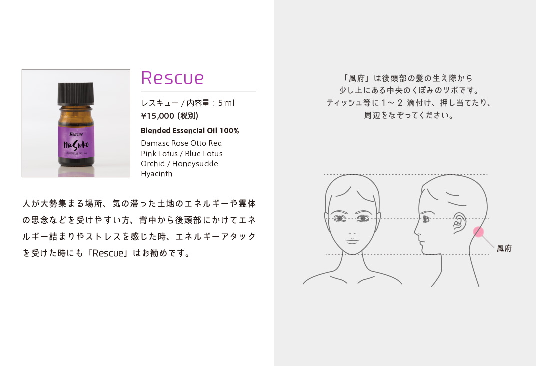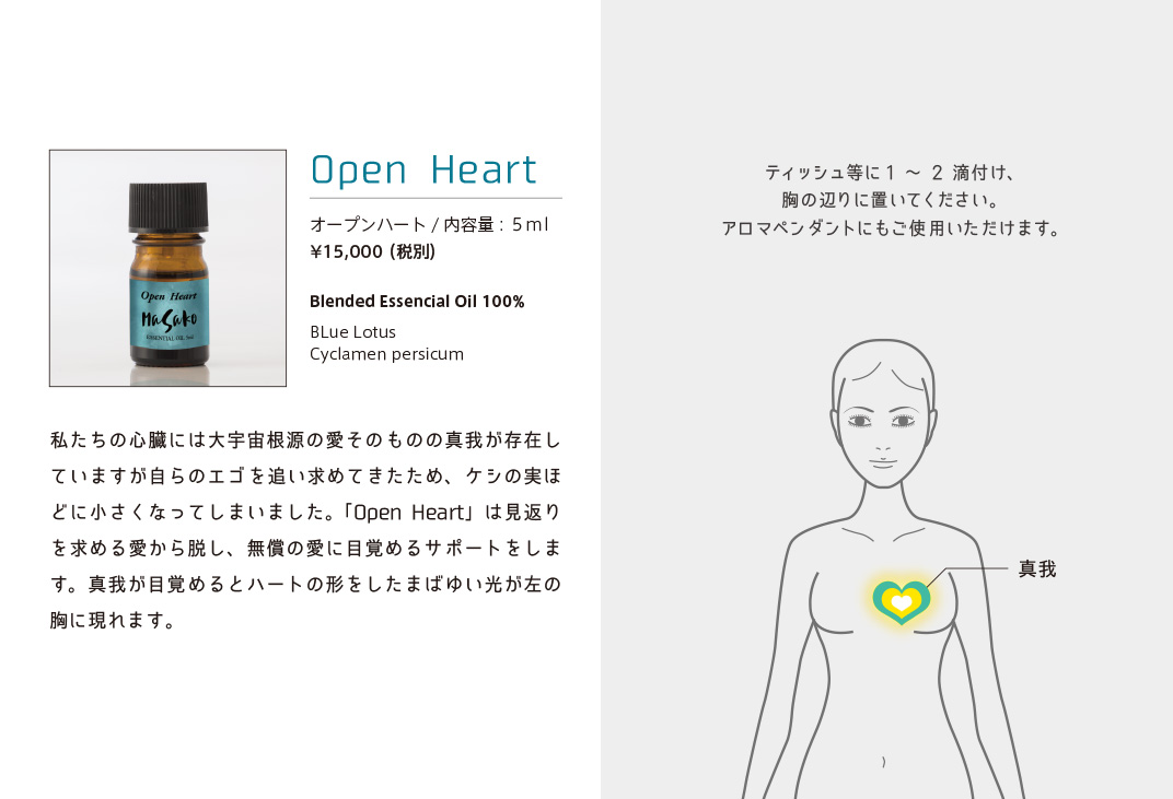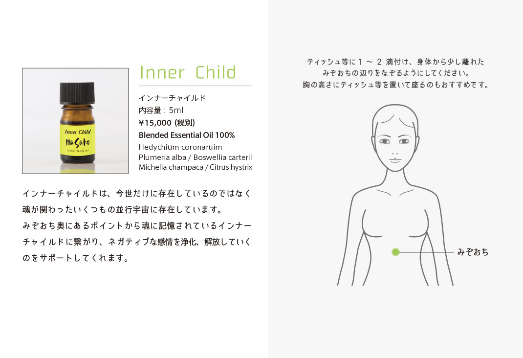 植物から抽出された100%エッセンシャルオイルはさまざまな分野で活用されています。香りごとに独自のエネルギーを持っていて私たちの身体を癒します。身体には13カ所のエネルギーの渦があり、それをチャクラと呼んでいます。精油とそれぞれのチャクラにあった周波数を照らし合わせ、独自の発想を用いMASAKO Essential Oilを開発しました。世界中から集めた100種類以上の最高級精油からセレクト、土地と環境、天候や気温、熟成度による精油の違いに配慮しながら注意深くブレンドした逸品です。日常生活におけるストレスの緩和や心身バランスを整えるため、より豊かに生活を楽しむためご愛用ください。